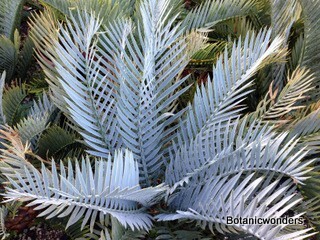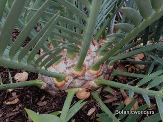 Encephalartos lehmannii is a beautiful blue cycad from the continent of Africa. It has quickly become one of my favorites. The species originates from South Africa, Eastern Cape province. This area is know for its desert like conditions. There is rainfall, however sporadic, and drought is common. Encephalartos lehmannii has beautiful blue leaves which make it a standout in the landscape. It's a medium sized cycad, rarely exceeding 4-5 feet in height. Leaves on mature plants can reach 3-5 feet in length. Leaflets are generally inserted in the rachis at an angle. When viewed in a cross section the leaflets form a "V" shape. There are some distinct variations of E. lehmannii. One of the better know variations comes from the area of Kirkwood, which it is named after. The Kirkwood form has leaves that are longer and more arched than the "typical" form. These forms are sought after by collectors for their "graceful" look. A useful feature used in identification is the yellow-tan collar where the leaflets are attached to the caudex of the plant. This coloration is more intense than the other blue cycads from South Africa. Older leaves will lose their blue color and turn green.