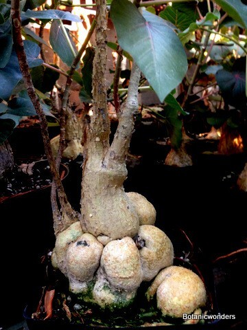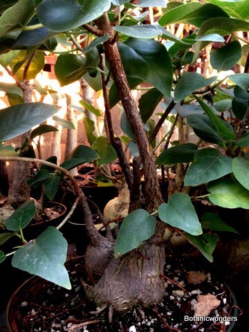 Ficus petiolaris is another of my favorite caudiciforms. Even at a young age this tree can produce a swollen stem with a lot of character. Ficus palmeri is very similar to F. petiolaris. Some botanists feel that they are just varieties of the same species. In my opinion there is significant difference between the two to be considered two distinct species. Both originate from Mexico. If grown in the ground these trees can grow large. I have grown most of my plants in containers, which stunts growth. This stunting eventually produces very interesting trunks and roots. The leaf of Ficus petiolaris has pinkish-red veins, while F. palmeri leaf veins are light green. Both species make excellent bonsai specimens. I have over ten special plants in my personal collection. I can't get enough of both types. I hope you will find the same!